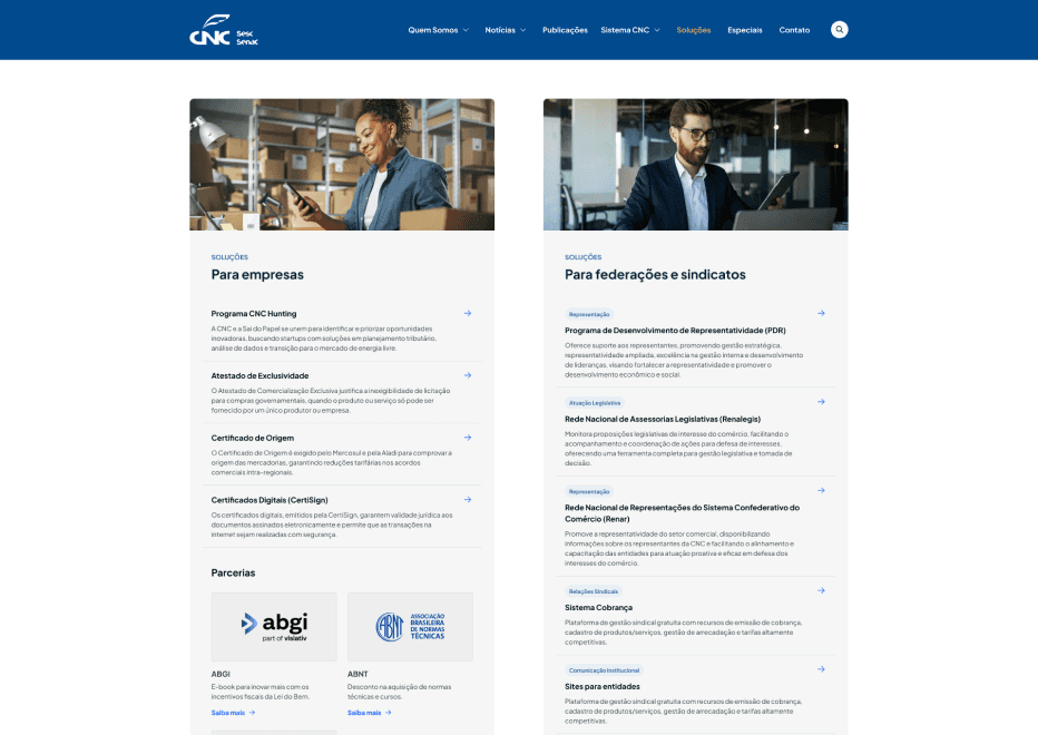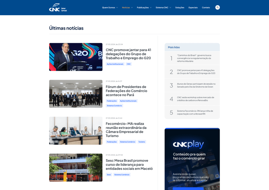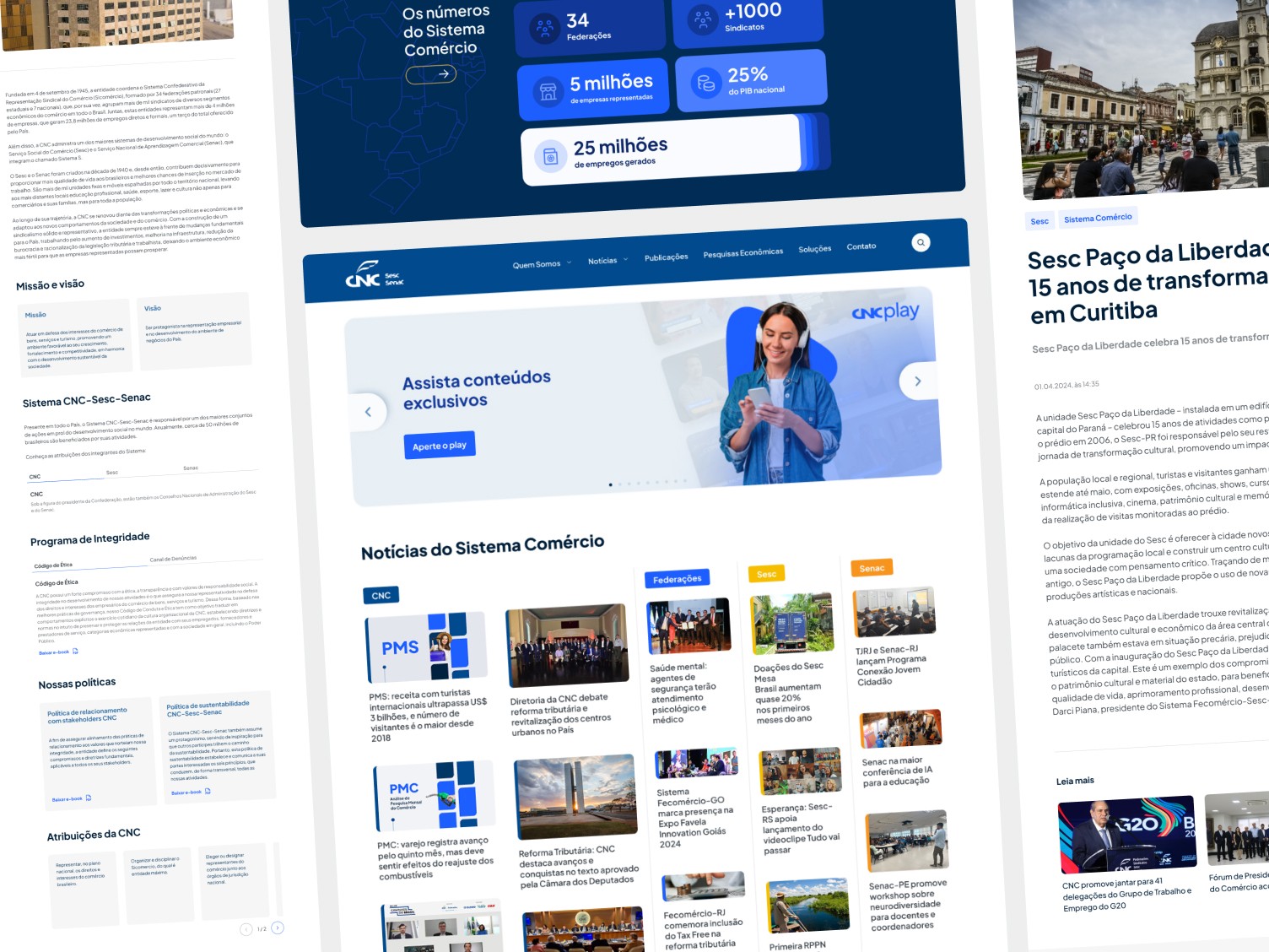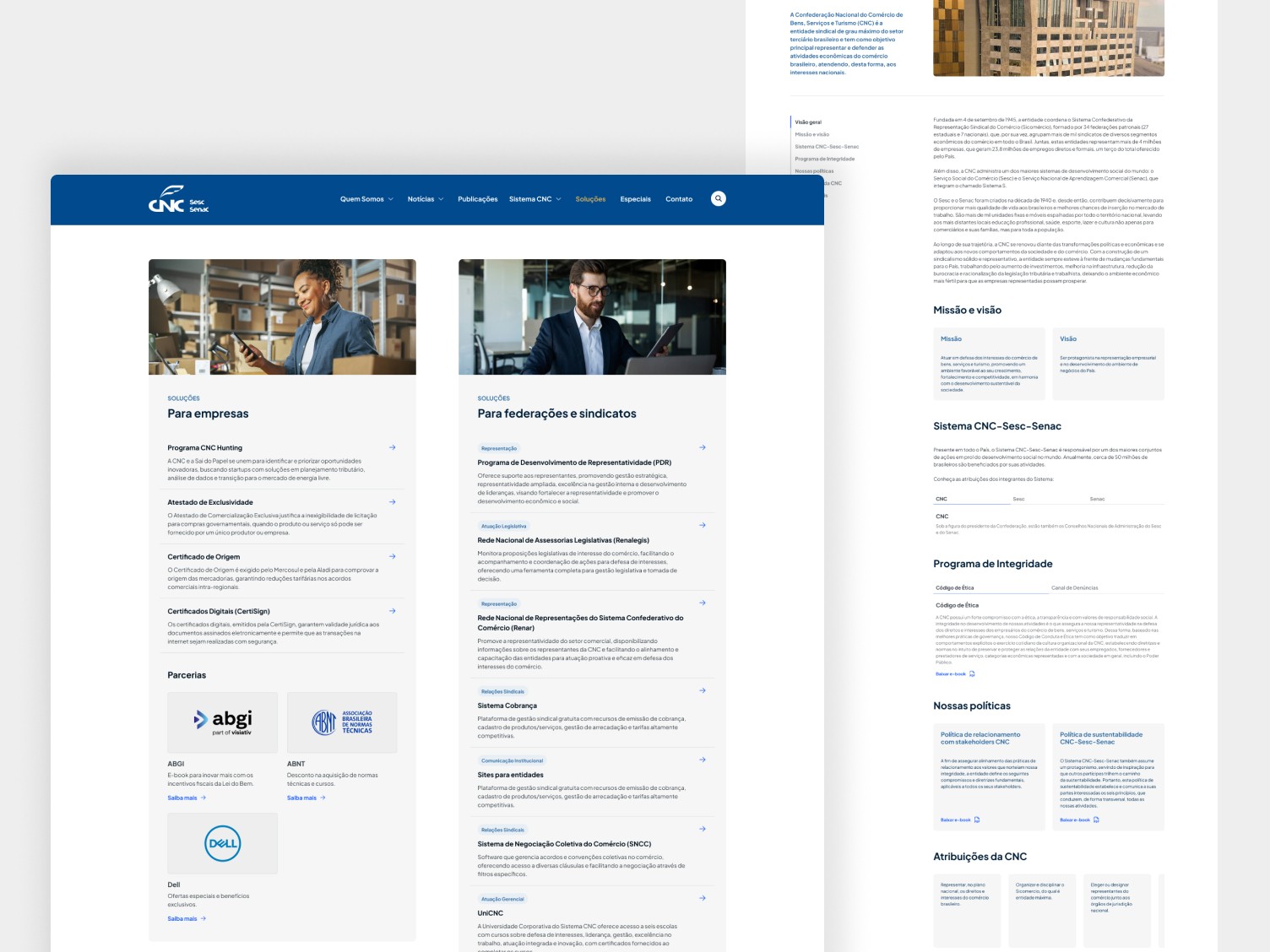A nova interface foi projetada seguindo diretrizes de UX e o Design System da CNC, reforçando a identidade institucional com cores e tipografia corporativas. Criamos uma experiência mais fluida e previsível, com menus claros, páginas modulares e componentes consistentes (cards, botões, formulários e carrosséis).