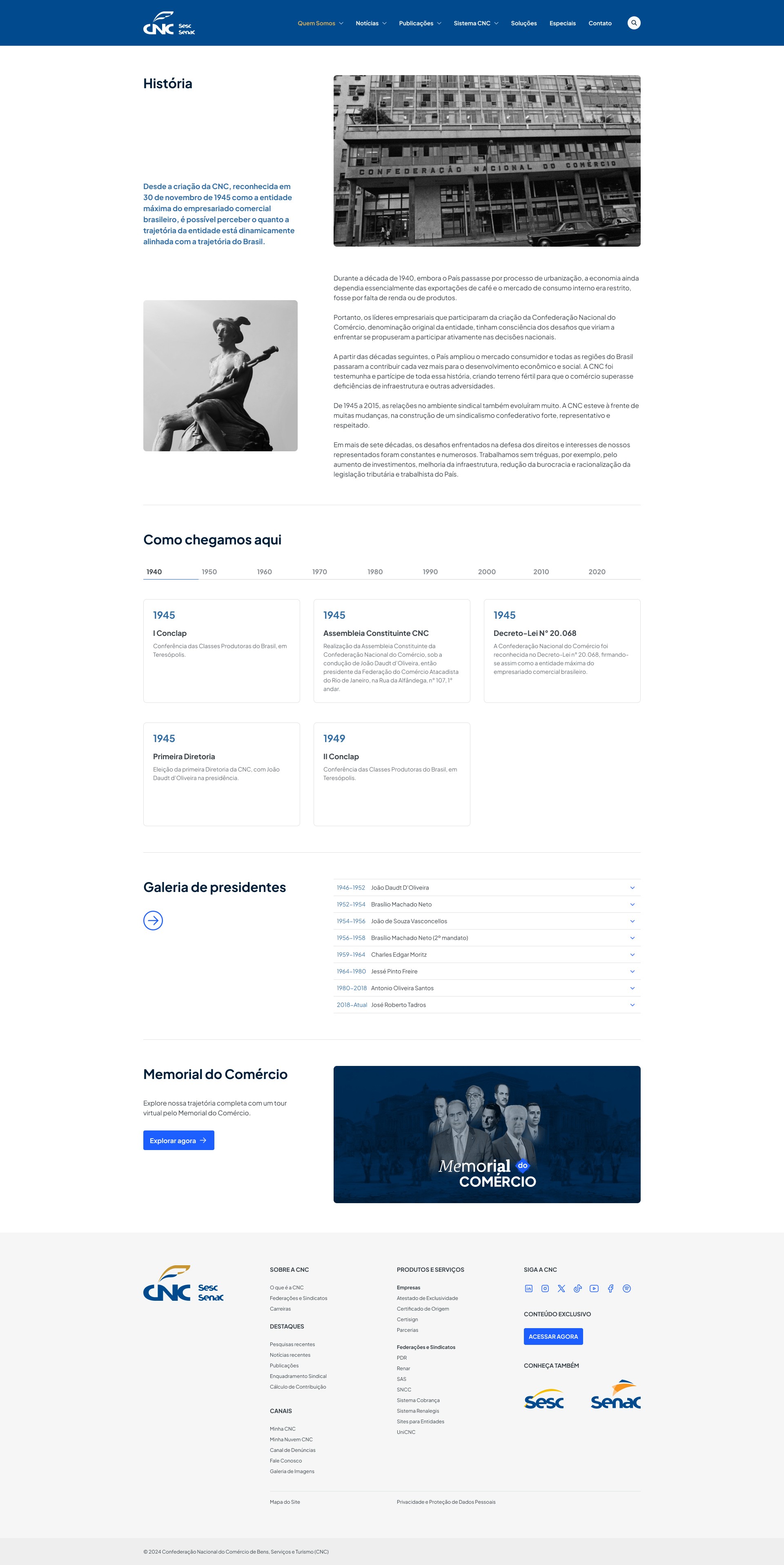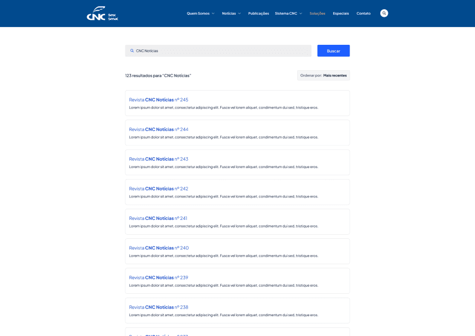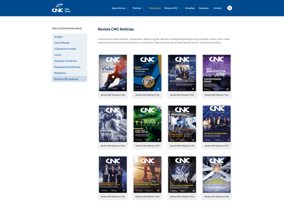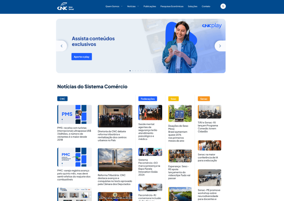 A nova interface foi projetada seguindo diretrizes de UX e o Design System da CNC, reforçando a identidade institucional com cores e tipografia corporativas. Criamos uma experiência mais fluida e previsível, com menus claros, páginas modulares e componentes consistentes (cards, botões, formulários e carrosséis).