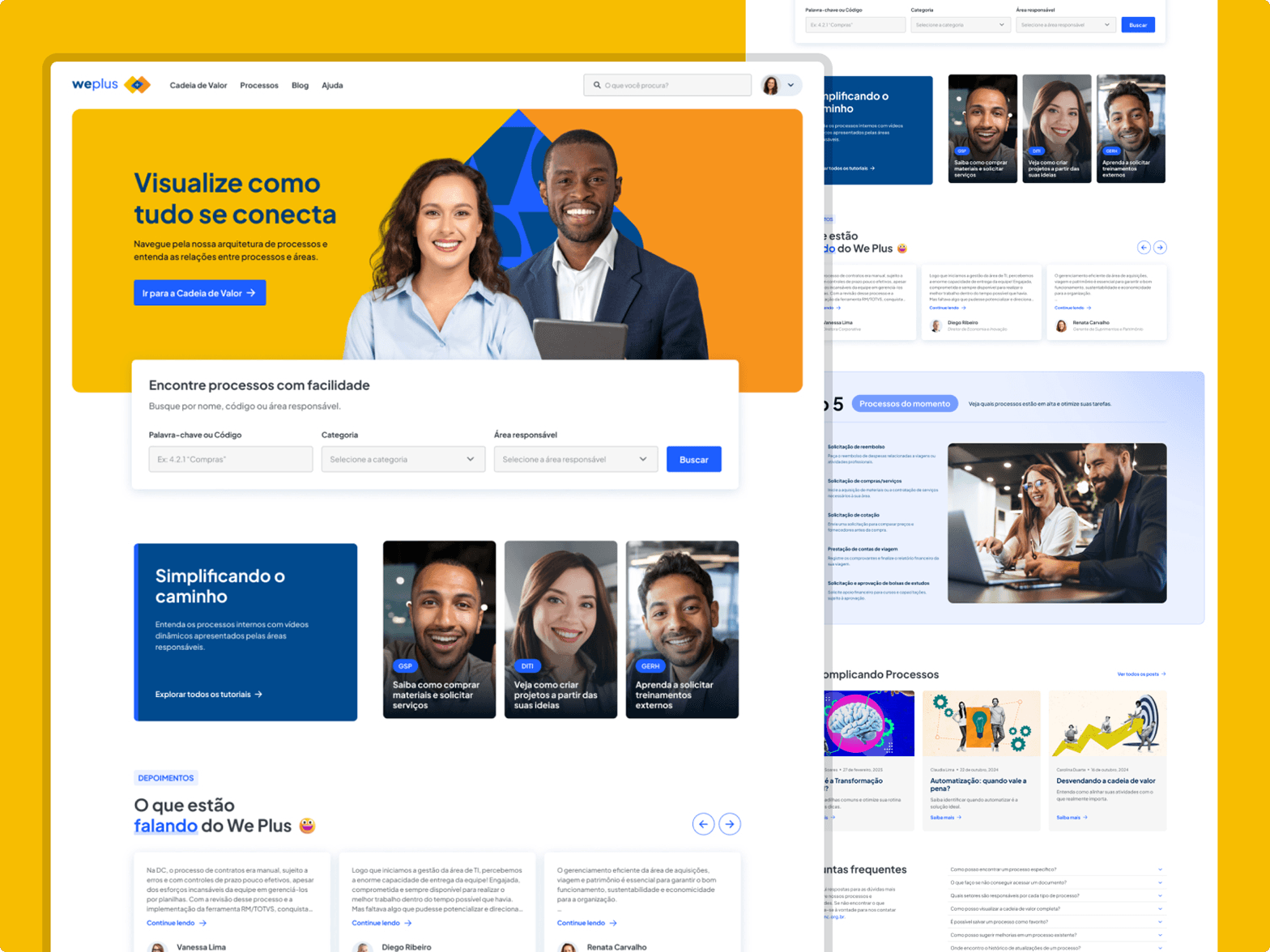 Para reduzir o esforço de navegação, a página inicial apresenta o Top 5 de processos mais acessados, destacando conteúdos de maior relevância. O ambiente também foi pensado para tornar o tema “processos” mais próximo e leve, com uma comunicação visual dinâmica e humana. Vídeos curtos explicativos gravados pelos próprios colaboradores ajudam a esclarecer procedimentos de forma prática, enquanto depoimentos mostram como diferentes áreas alcançaram mais eficiência e clareza com processos bem estruturados.